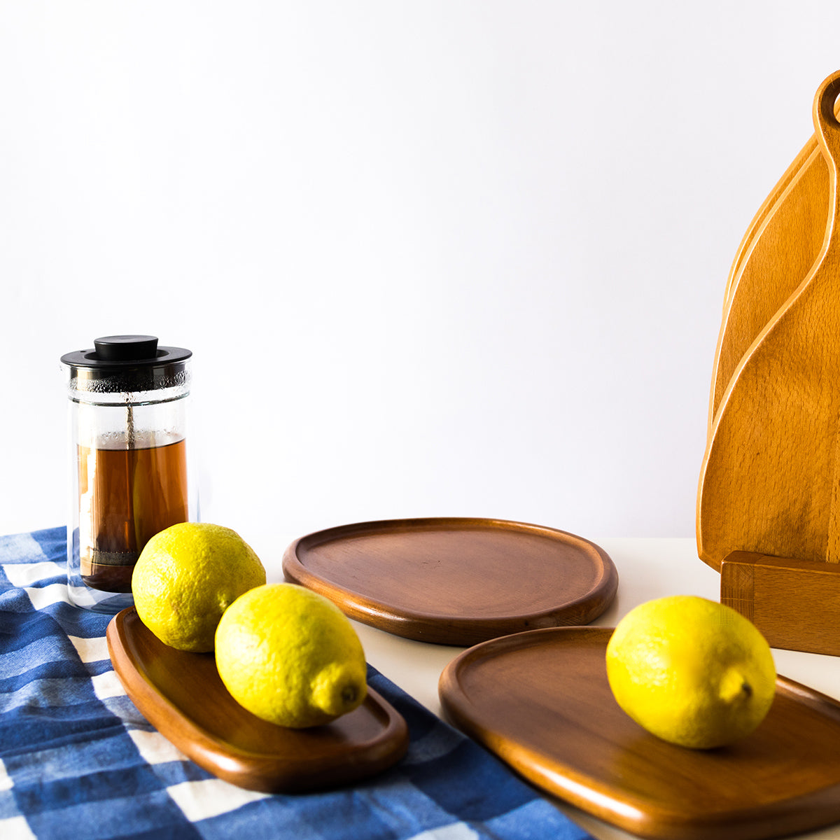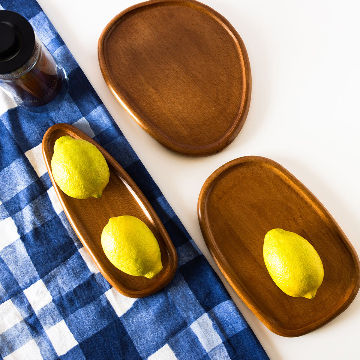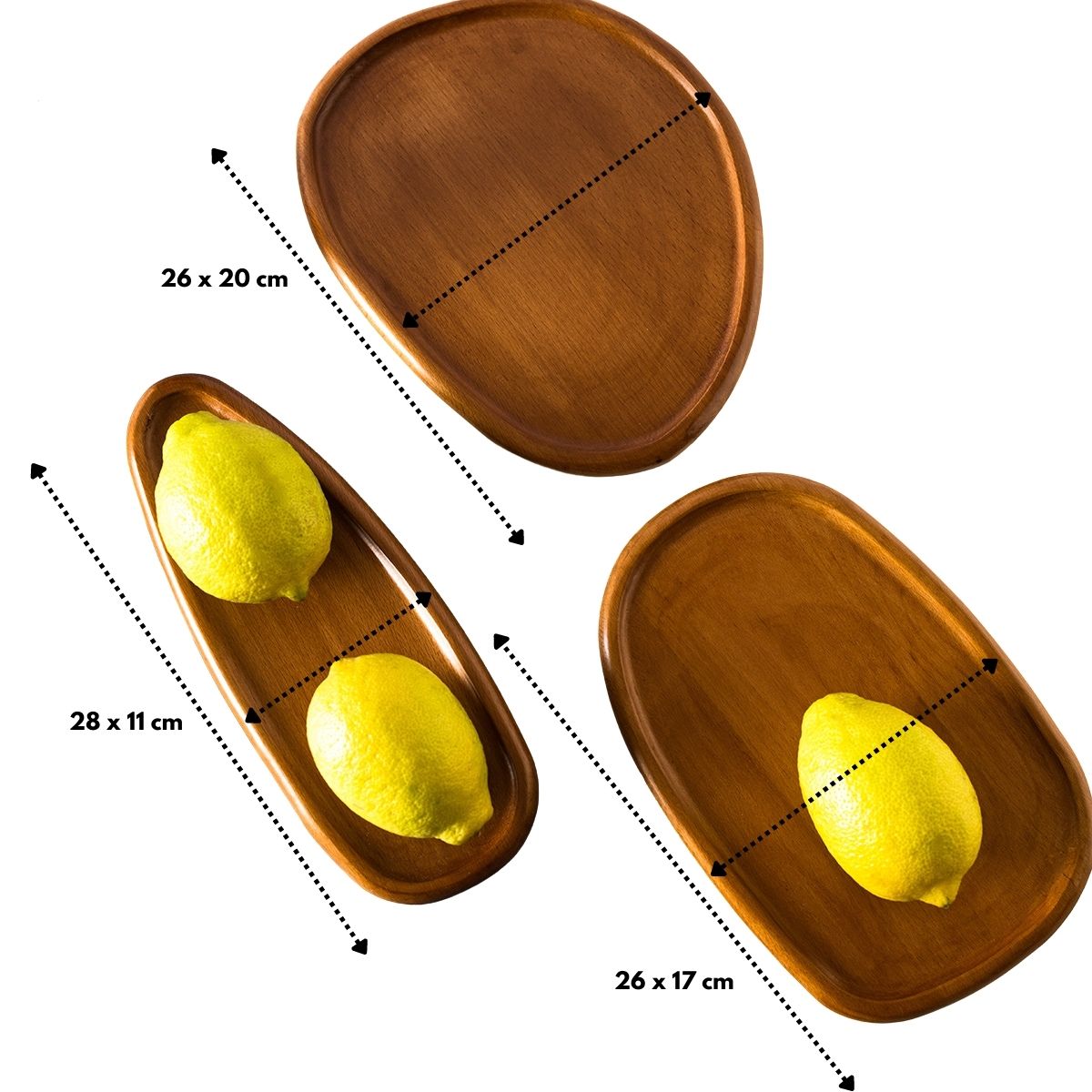 Three different-sized wooden plates or trays which can be used for serving and decorating.