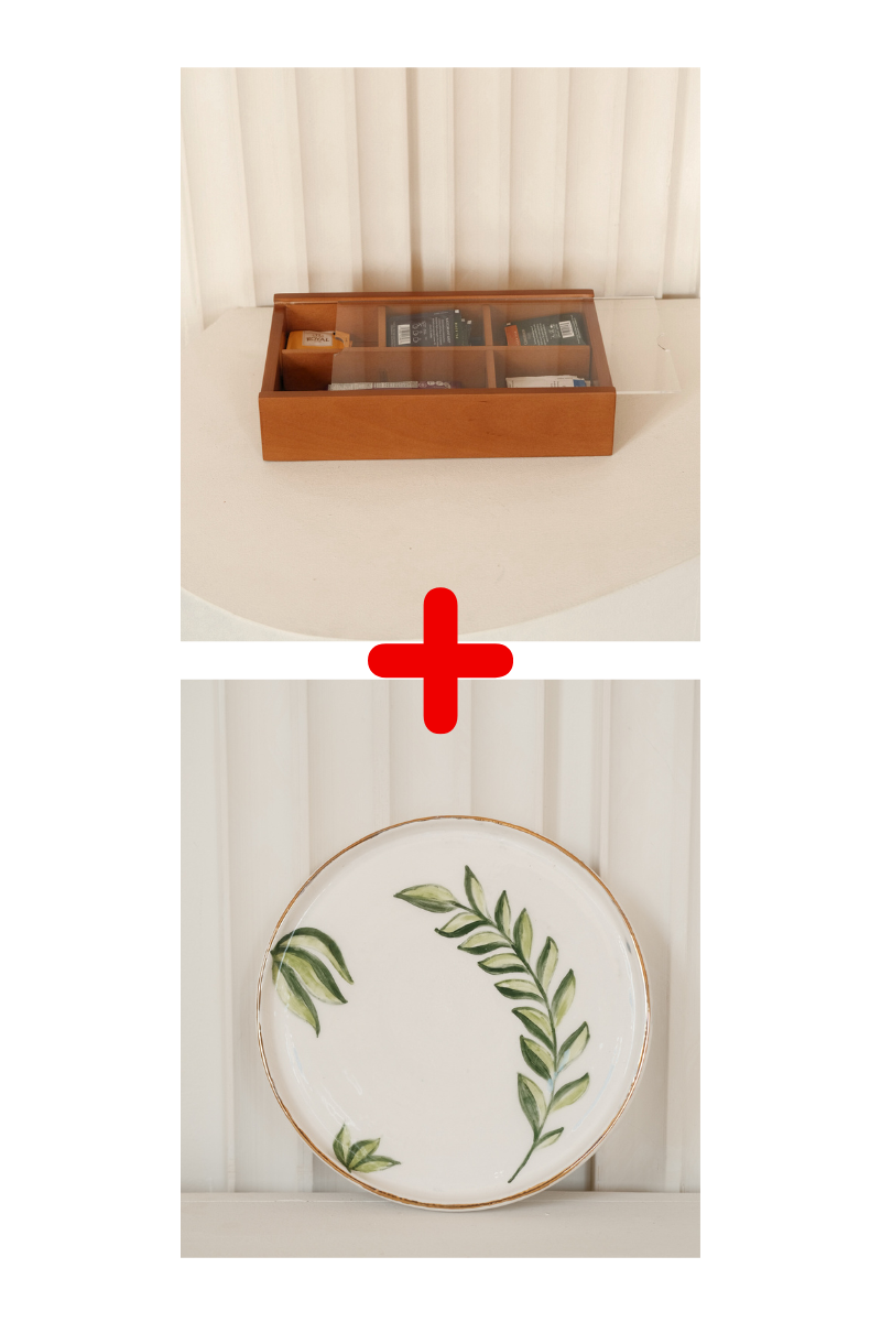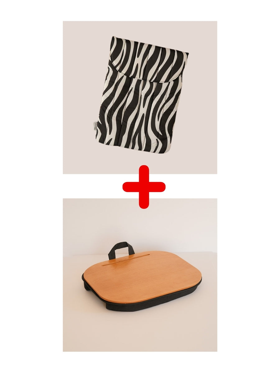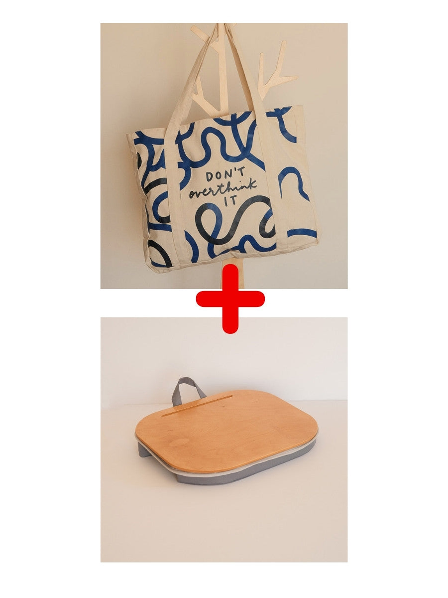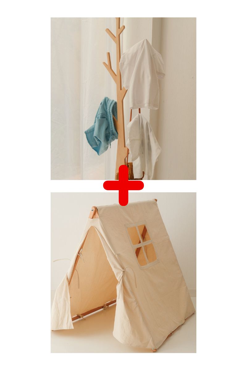 The image shows a creativity bundle consisting of a wooden activity corner duo with a table and two chairs, and a wooden storyhouse bookshelf with various toys and books on the shelves.