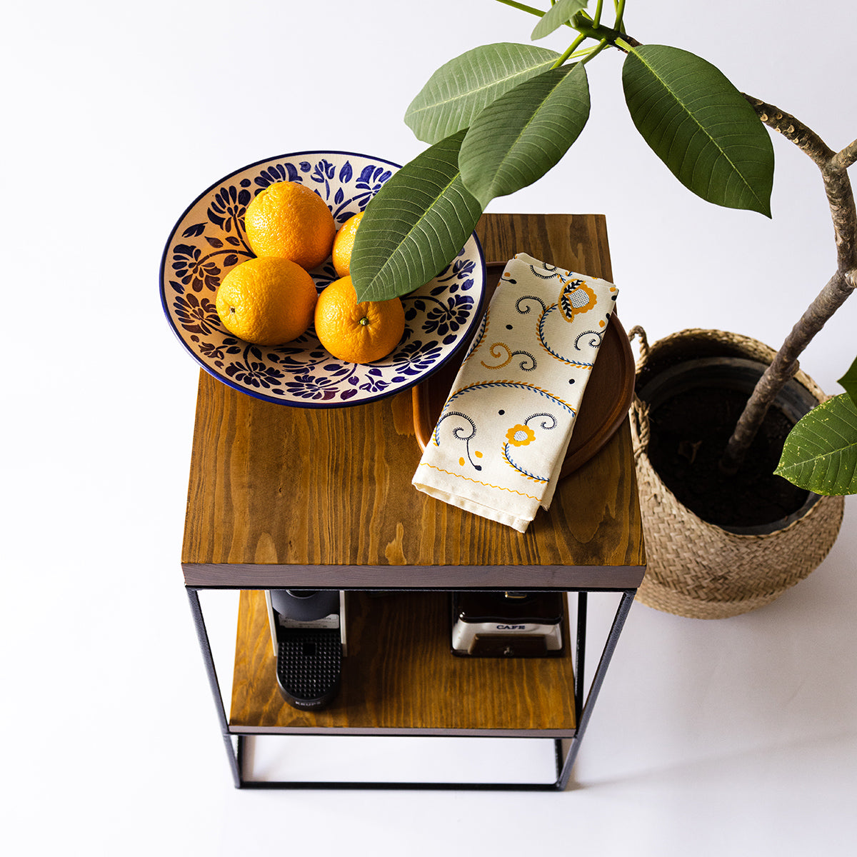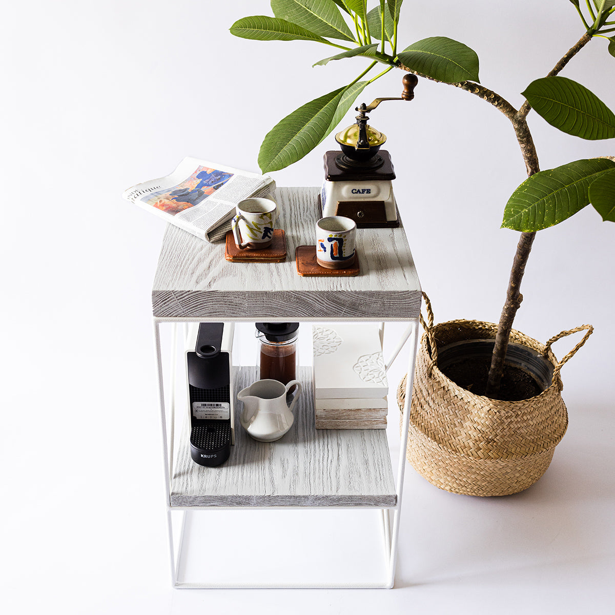 This multi-use, compact, space-saving Side Table makes an amazing Coffee Corner with Two useful natural massive wood shelves.